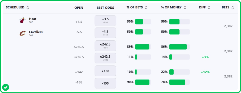 The Cavaliers are 3.5-point favorites over the Heat on the spread (Cavaliers -3.5), with the over/under set at 242.5 total points. Cleveland is a -154 favorite to win outright on the moneyline, while Miami is +130 to pull off the upset.