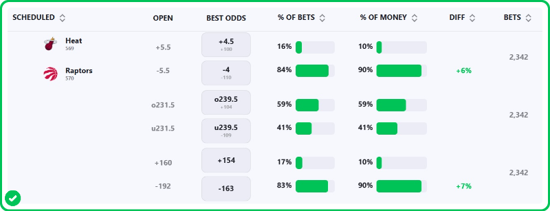 The Raptors are 4.5-point favorites over the Heat on the spread (Raptors -4.5), with the over/under set at 238.5 total points. Toronto is a -180 favorite to win outright on the moneyline, while Miami is +150 to pull off the upset.