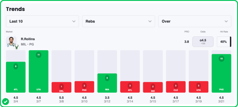 Action PRO is projecting 3.5 rebounds for Rollins in the Bucks' matchup against the Clippers tonight, presenting a huge 21.3% edge against the market when compared to his current prop line of over/under 4.5, which is good enough to mark the Under with an A+ grade in our system.