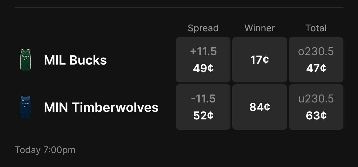 The Timberwolves are -11.5 favorites over the Bucks on the spread (Timberwolves -11.5), with the over/under set at 230.5 total points. Minnesota is an 84-cent favorite to win outright on the moneyline, while Milwaukee is priced at 17 cents to pull off the upset on Fanatics Markets.