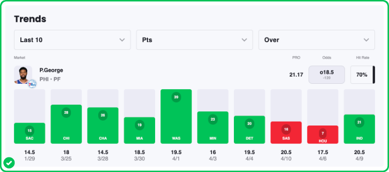 George has scored 19 or more points in eight of his nine games since returning to the hardwood. He isn't just squeaking past this number, either — he’s been an efficient primary scoring option who has treated the 19-point mark as his absolute floor.