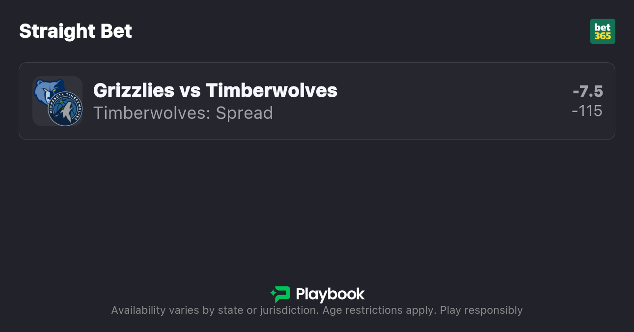 The Timberwolves are 7.5-point favorites over the Grizzlies on the spread (Timberwolves -7.5), with the over/under set at 229.5 total points. Minnesota is a -310 favorite to win outright on the moneyline, while Memphis is +250 to pull off the upset.