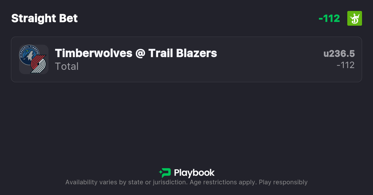 - Timberwolves vs Trail Blazers pick: Under 236.5 (-112)