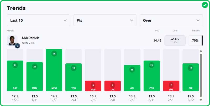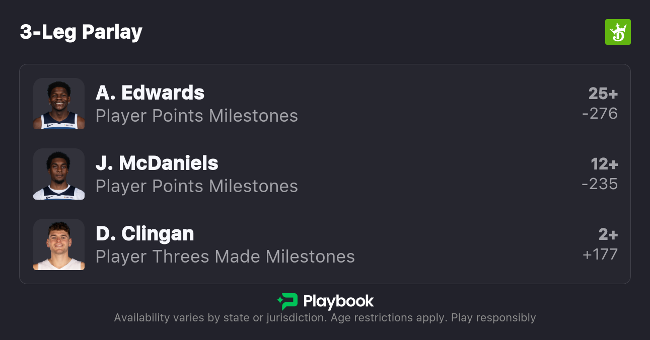 Jaden McDaniels has scored 17 points in four of his last five games against Portland, with 30, 18 and 21 in the last three meetings. He has scored 12 points in seven of his last 10 games overall, averaging 16.2 points in that span.