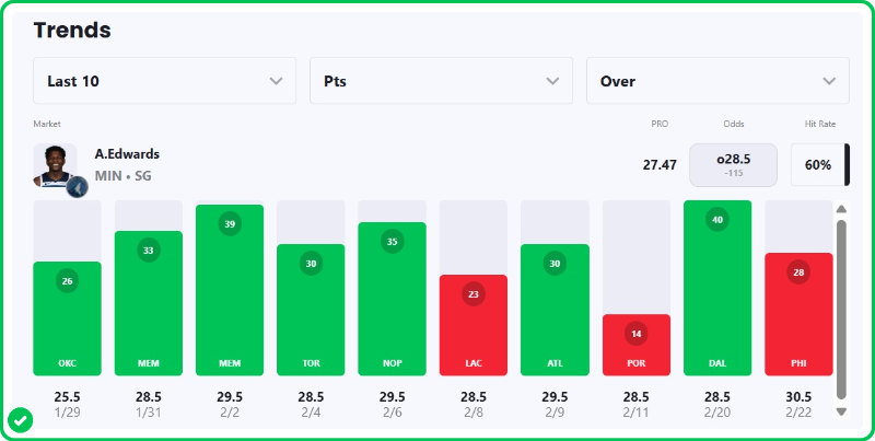 Edwards has scored 20 points in 19 of his past 20 games. In that span, he is averaging 29.9 points per game, a tick above his season average.