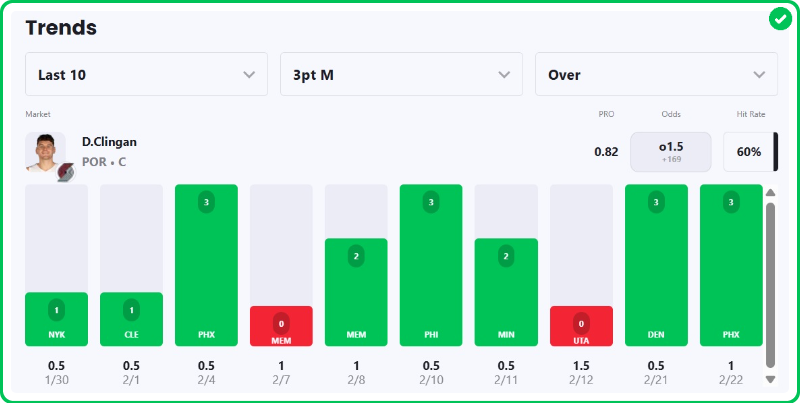 Clingan's scoring uptick has coincided with more volume from the perimeter. He has made two 3s in six of his last eight games, and in both games against Minnesota this season.