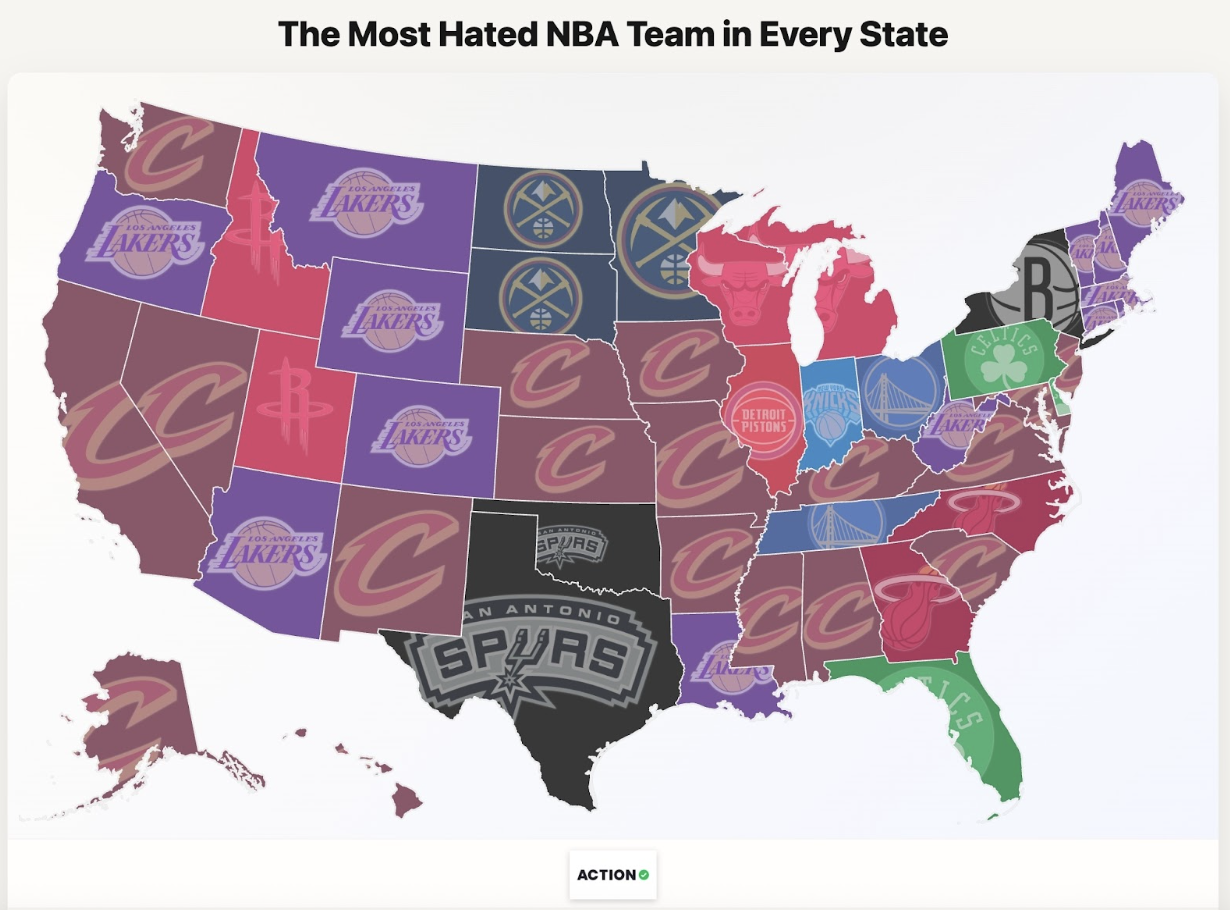 - The Cleveland Cavaliers are the most hated team in 18 states — by far the widest spread of any franchise.