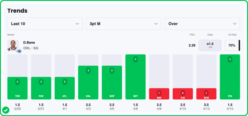Bane has been the primary perimeter engine for an Orlando offense that desperately needs floor spacing to allow Paolo Banchero room to operate. Our PRO Projection of 2.29 makes provides a healthy cushion over the 1.5 line.