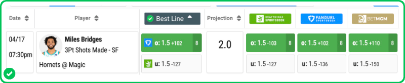 Our PRO Projection of 2.02 makes gives us a significant edge against the market price of -102. In a do-or-die environment where LaMelo Ball and Brandon Miller attract the bulk of the defensive attention, expect Bridges to continue finding high-quality looks from the corners and wings.
