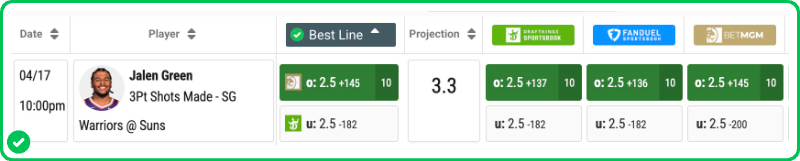 Our PRO Projection of 5.32 makes indicates a nice edge on this +105 line. Phoenix's defense struggled against perimeter volume in their Play-In loss to Portland, and with Dillon Brooks likely focused on Curry's knee and driving lanes, Steph is poised to rely on his signature relocation 3s.