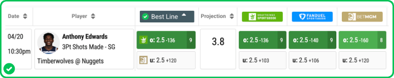 Action PRO is projecting Anthony Edwards to make 3.8 three-pointers in Game 2 against the Nuggets tonight, while the market has set his line at 2.5.