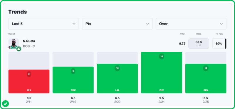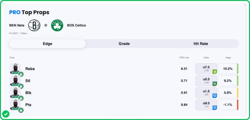 Action PRO is projecting 8.31 rebounds for Neemias Queta in the Celtics' matchup against the Nets tonight, presenting a 10.2% edge against his current rebounds prop line of over/under 7.5, which is good enough to tag the Over with a B-grade in our database.