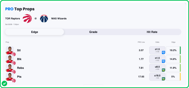 Action PRO is projecting 2.07 steals for Scottie Barnes in the Raptors' matchup against the Wizards tonight, presenting a solid 19.2% edge against his current prop line of over/under 1.5, which is strong enough to give the Over an A-grade in our database.