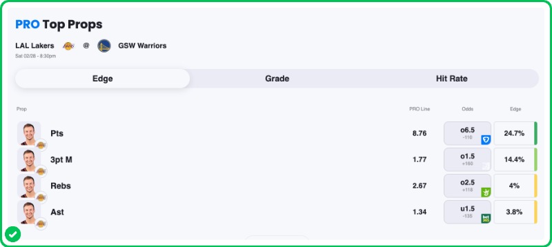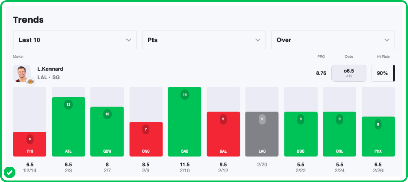 Action PRO is projecting 8.76 points for Luke Kennard in the Lakers' matchup against the Warriors tonight, showing a massive 24.7% edge against his current points prop line of over/under 6.5, which is good enough to tag the Over with an A+ grade in our database.