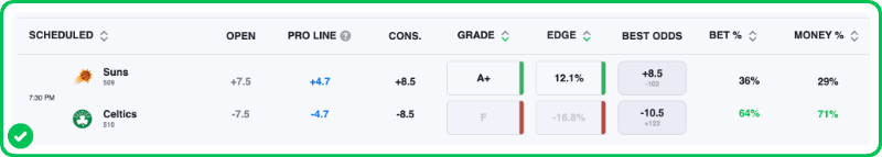 Action PRO projects the spread for this game at Celtics -4.7, presenting an excellent 12.1% edge against the current line, which is strong enough to tag Suns +8.5 with an A+ grade in our database.