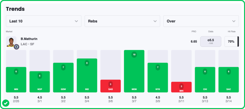Plus, his rebounding numbers were a little bit shakier when he first joined the team. Mathurin enters tonight's contest having recorded 6+ rebounds in nine of his last 12 games.