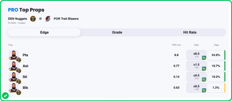 Action PRO is projecting 8.8 points for Jonas Valanciunas in tonight's matchup against the Trail Blazers, giving the Over a 24.6% edge against his current points prop line of over/under of 6.5, which is good enough for an A+ grade in our database.
