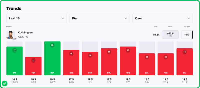 With only J-Dub sidelined, Holmgren is averaging 17.6 points per game, and has gone Under this mark in 14-of-25 games.