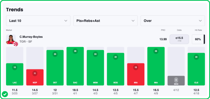 Collin Murray-Boyles is their best shot at a big man who can play both ways. He played 20 minutes last game and turned in a 14/4/4 line—that’s 22 PRA, well clear of this number.