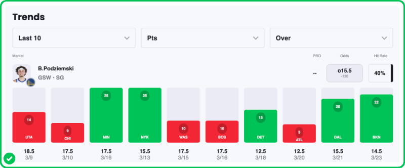 Pick: Brandin Podziemski Over 15.5 Points (-120)