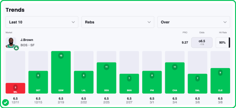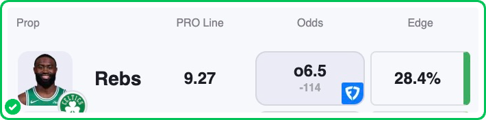 Action PRO is projecting 9.27 rebounds for Jaylen Brown in the Celtics’ matchup against the Spurs tonight, showing a massive 28.4% edge against his current prop line of over/under 6.5, which is strong enough to tag the Over with an A+ grade in our database.