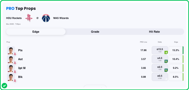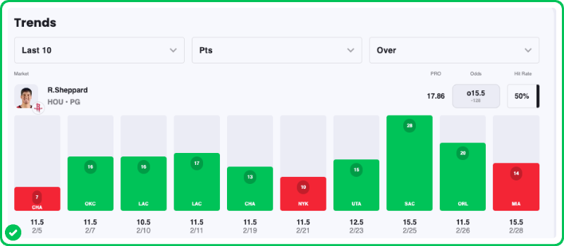 Action PRO is projecting 17.86 points for Reed Sheppard in the Rockets' matchup against the Wizards tonight, presenting an excellent 15.3% edge against his current prop line of over/under 15.5, which is strong enough to tag the Over with an A- grade in our database.