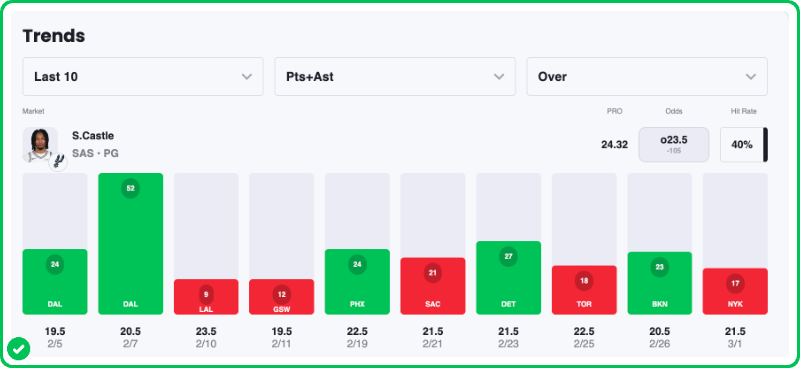 Castle is averaging 23.4 Points + Assists on the season, and he’s hit this Over in half of his games since the All-Star Break.