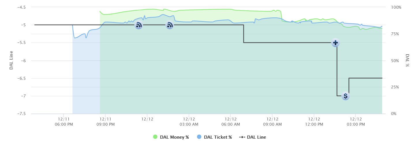 Interestingly most of the action on the spread in this game occurred before the Pistons announced Andre Drummond was questionable to play. The first steam move was on the Pistons at +5.5 and shortly after there was one on the Mavericks at -5.