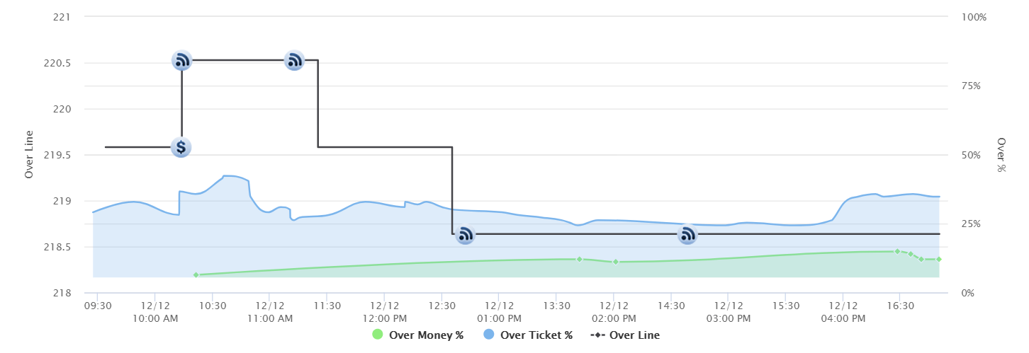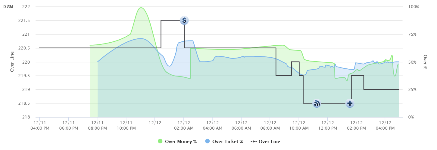 The over/under has been all over the place, and we've tracked two steam moves, both on the under at 219 and 220 (the latter after the injury news).