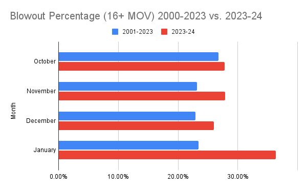 - The In-Season Tournament: Now, as seen above, blowouts are each month this season vs. historical averages. But the In-Season Tournament made players push a little harder in November than previously. There may be a letdown now with being so far removed from games that mattered a little more.