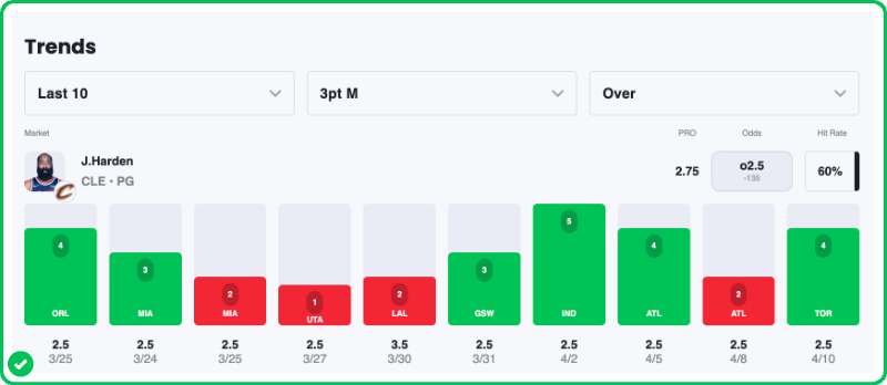 Harden's 3.1 3-pointers per game is only slightly behind Mitchell, who averages 3.2. It's worth noting that Harden has been the better shooter, as evidenced by his 3-point percentage (37.5%), which improves to 43.5% since his trade to Cleveland.