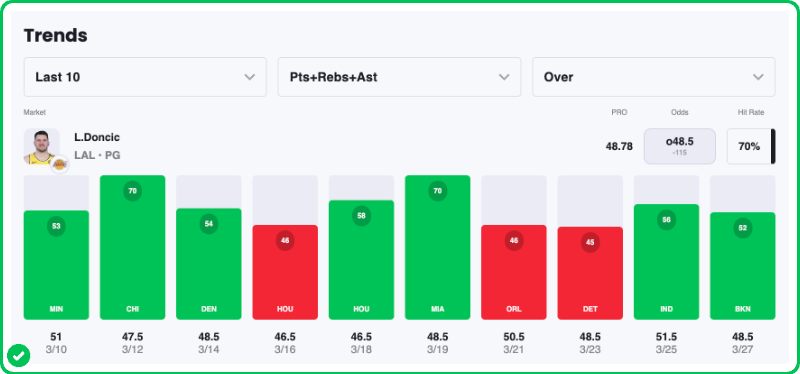 Luka has the highest PRA total on the board at over/under 48.5 — and he's rested after missing yesterday's game due to a 1-game suspension for receiving his 16th technical foul.