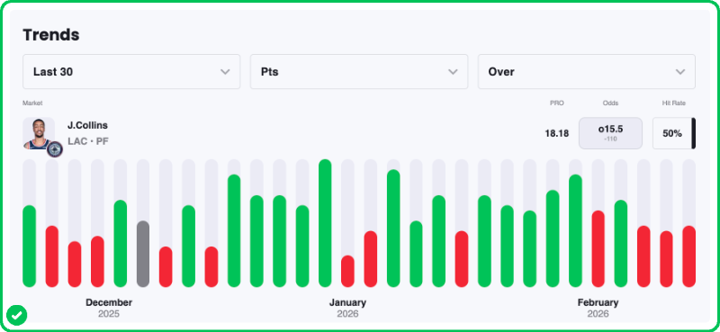Action PRO is projecting 18.18 points for John Collins in the Clippers' matchup against the Wolves tonight, presenting a huge 21.3% edge against his current points prop line of over/under 15.5, which is strong enough for another A+ grade in our database.