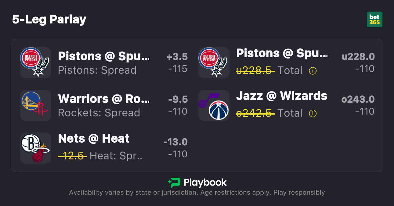 The NBA regular season is back in action with a loaded 9-game slate for this Thursday. So, I've locked in a total of seven picks spanning four of today's contests, including bets for Pistons vs. Spurs, Nets vs. Heat, Warriors vs Rockets, and more.