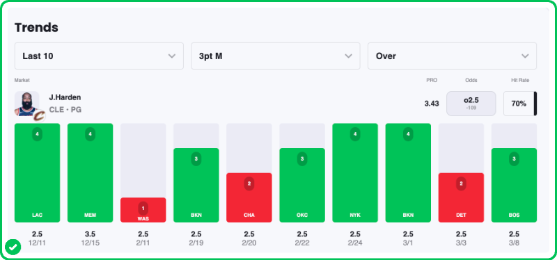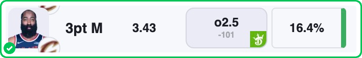 Action PRO is projecting James Harden to make 3.43 three-pointers in the Cavaliers' matchup against the 76ers tonight, showing a huge 16.4% edge against his current prop line of over/under 2.5, which is strong enough to tag the Over with an A- grade in our system.