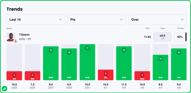 While the stars will grab the headlines, the real value lies in the Rockets’ rotation shift. We will be targeting Tari Eason Over 9.5 Points (-120).