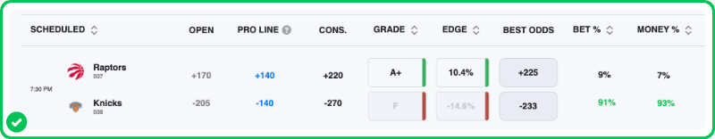 Tonight at Madison Square Garden, our Bet Labs "Fade Public Small 'Dogs" system has flagged the Raptorsmoneyline (+215) as a high-value play. The Raptors are big underdogs in this game. However, the current price and circumstances create a mathematical edge that’s hard to ignore.