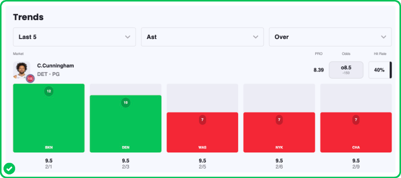 Further, Cade is only averaging 8.6 assists per game on the season. This line at 9.5 is high regardless.