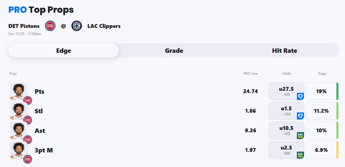 PRO projects Pistons guard Cade Cunningham for 24.74 points tonight, a nice 19% edge against the market when compared to his 27.5 line.