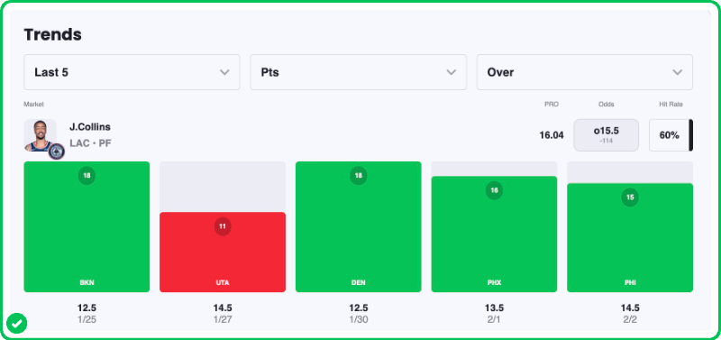 Collins enters tonight already having scored 15+ points in four of his last five games, and I expect him and Kawhi to be the main beneficiaries of Harden's departure in this game.
