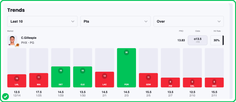 Allen was playing some great ball before the All-Star break, going over this 19.5 PRA number in 10 straight games.