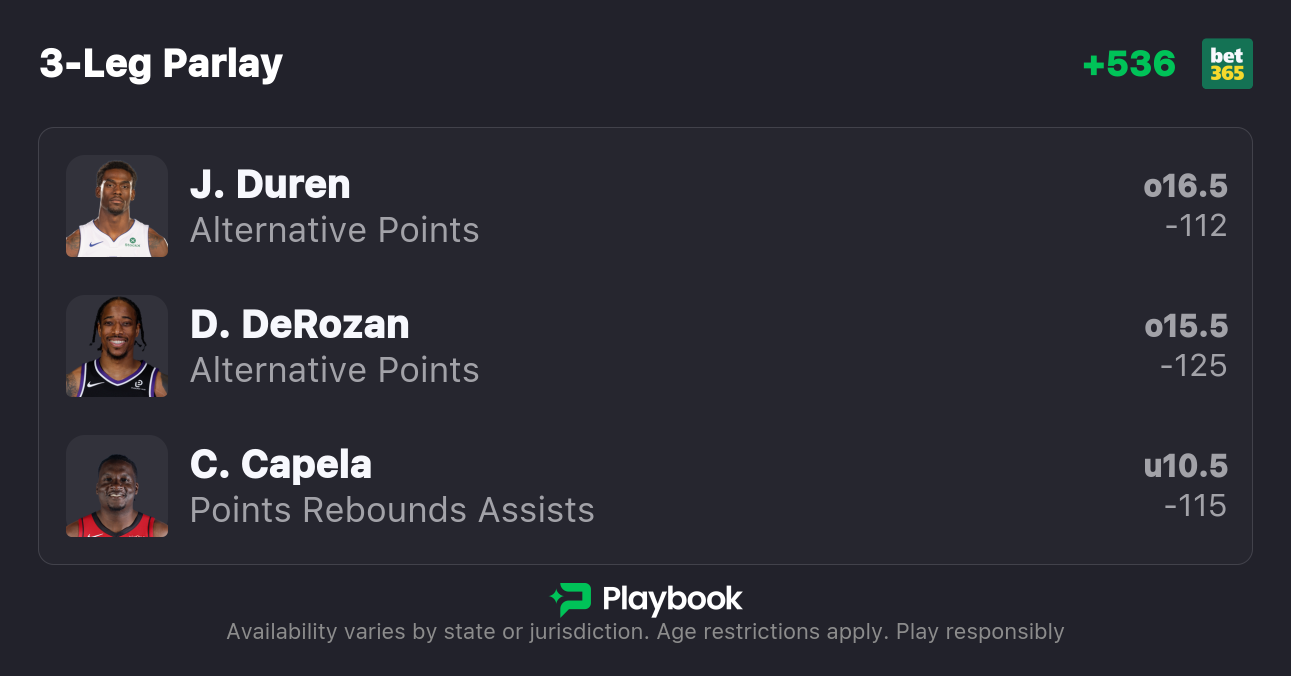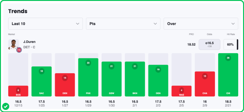 Duren is on a bit of a heater right now. He's averaging 17.8 points per game on the season. However, he enters tonight's matchup having scored 18+ points in six of his last nine outings, while scoring 21+ points in four of those contests and 23+ points in two of them.