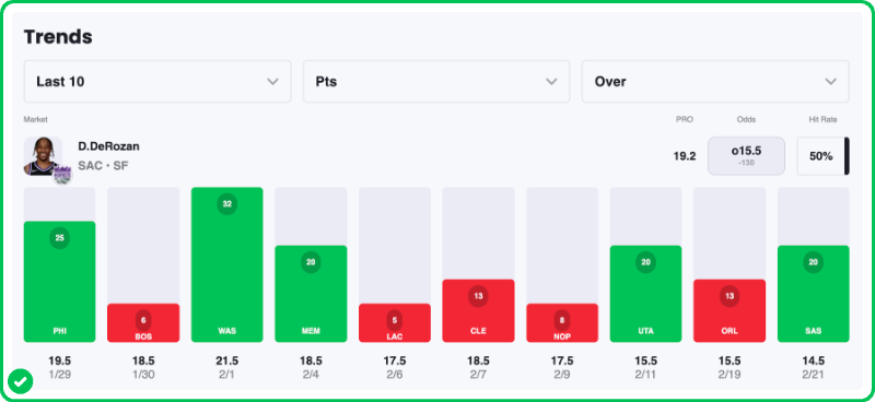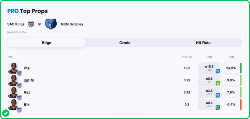Action PRO is projecting 19.2 points for DeMar DeRozan in the Kings' matchup against the Grizzlies tonight, showing a massive 24.8% edge against his current points prop line of over/under 15.5, which is good enough to give the Over an A+ grade in our database.
