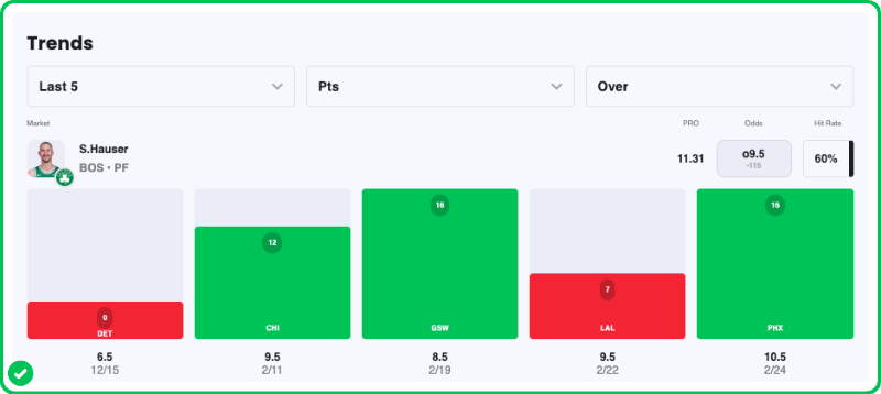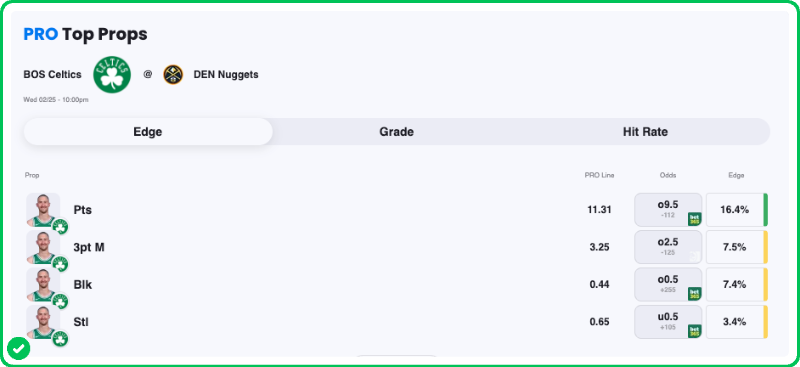 Action PRO is projecting 11.31 points for Sam Hauser in the Celtics' matchup against the Nuggets tonight, showing a 16.4% edge against his current points prop line of over/under 9.5, which is good enough to give the Over an A- grade in our database.