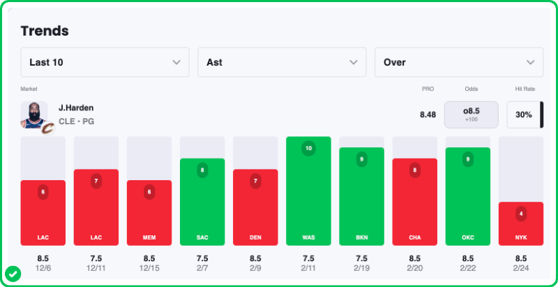 Since joining the Cavaliers, James Harden is averaging 8.0 assists and 13.3 potential assists in seven games.