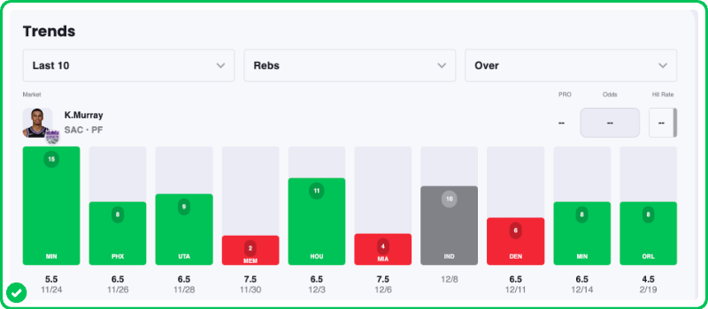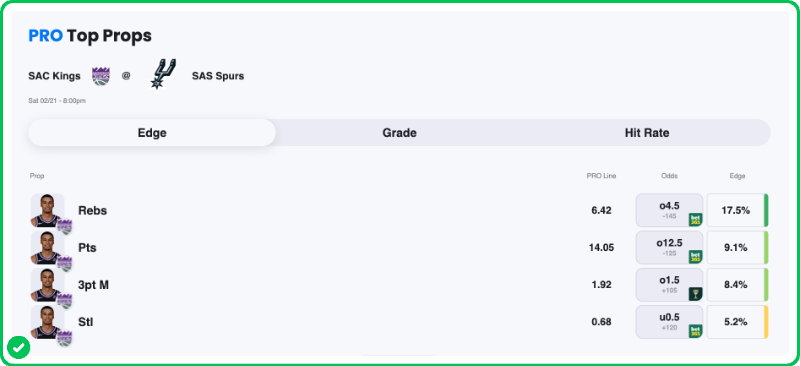 Action PRO is projecting 6.42 rebounds for Keegan Murray in the Kings' matchup against the Spurs tonight, giving us a 17.5% edge against his current rebounds prop line of over/under 4.5, which is good enough for an A- grade in our database.