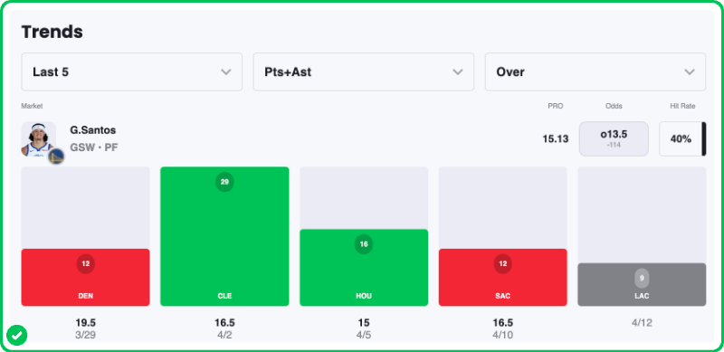 His Points + Assists prop is available at 13.5, a number he cleared just once in his last five away games. Santos has also stayed under this prop line in his last five meetings with the Clippers.