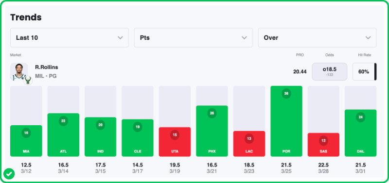 Tonight, Rollins and the Bucks draw a very difficult matchup agains the Celtics — but somebody's gotta score for Milwaukee, right? So, we still see value in backing Rollins to perform here.