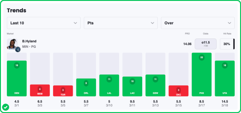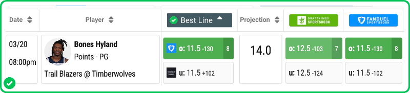 Action PRO is projecting 14.05 points for Bones Hyland in the Timberwolves' matchup against the Trail Blazers tonight, showing a massive 18.9% edge against his current prop line of over/under 11.5, which is strong enough to tag the Over with an A grade in our database.