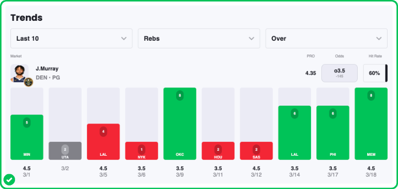 Zooming out a little bit further, Murray has tallied 4+ rebounds in seven of his last 11 outings, while reaching 5+ rebounds in six of those contests; and getting all the way up to 6+ rebounds in five of them.